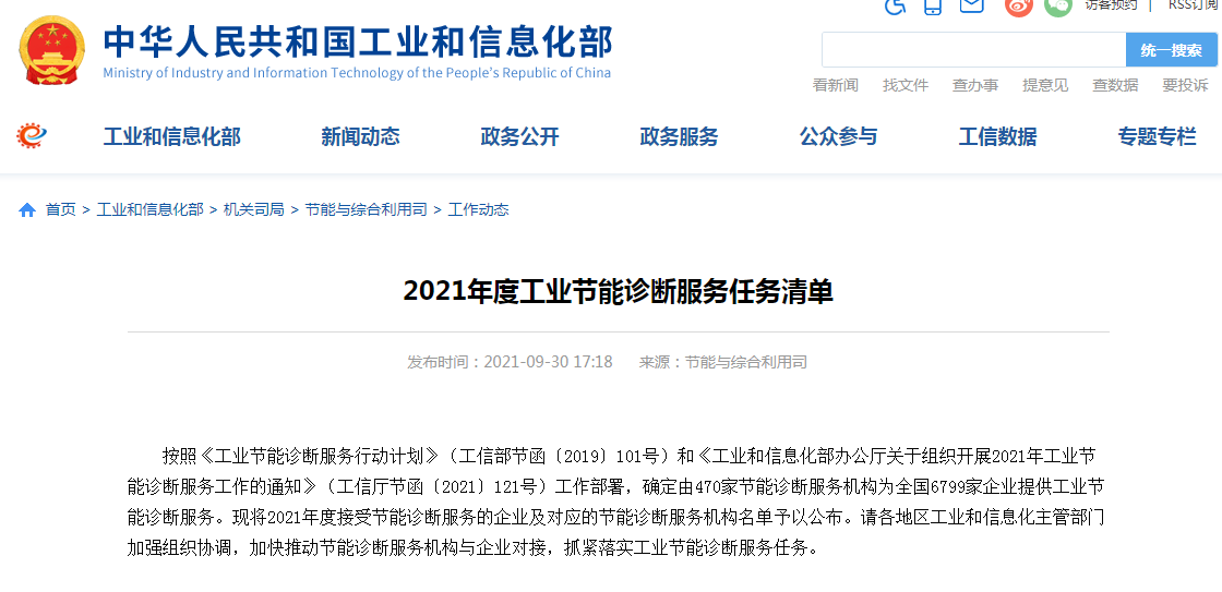 根據(jù)2021年9月30日,國(guó)家工業(yè)和信息化部《工業(yè)節(jié)能診斷服務(wù)行動(dòng)計(jì)劃》(工信部節(jié)函〔2019〕101號(hào))和《工業(yè)和信息化部辦公廳關(guān)于組織開(kāi)展2021年工業(yè)節(jié)能診斷服務(wù)工作的通知》(工信廳節(jié)函﹝2021﹞121號(hào))工作部署。