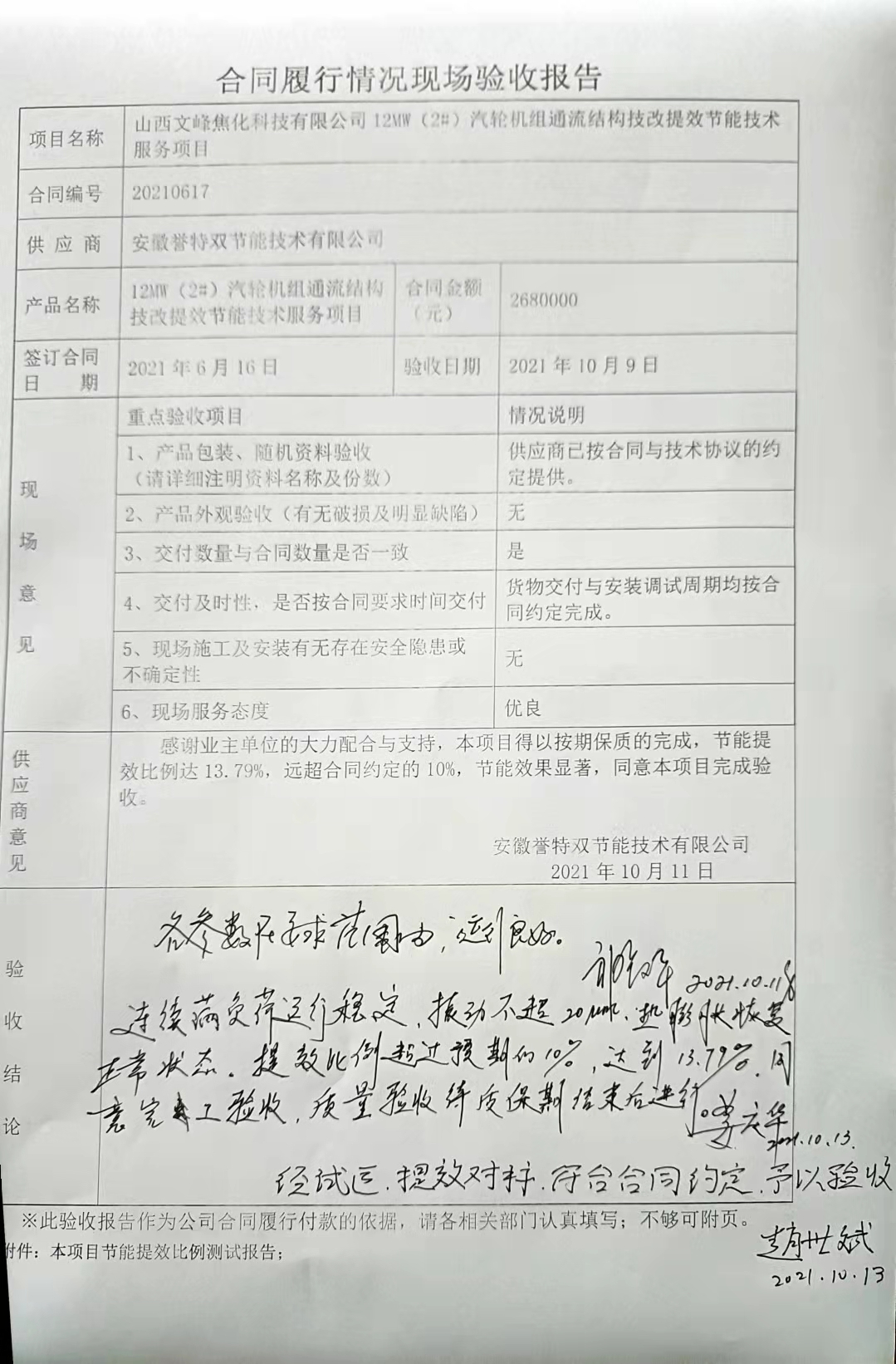 本項目客戶驗收評價為“各參數(shù)在要求范圍內(nèi),運行良好;連續(xù)滿負(fù)荷運行穩(wěn)定,振動不超出2絲,熱鼓脹恢復(fù)正常狀態(tài),提效比例超過預(yù)期的10%,達(dá)到13.79%,同意完工驗收,質(zhì)量驗收待質(zhì)保期結(jié)束后進行;經(jīng)試運,提效對標(biāo),符合合同約定,予以驗收”。