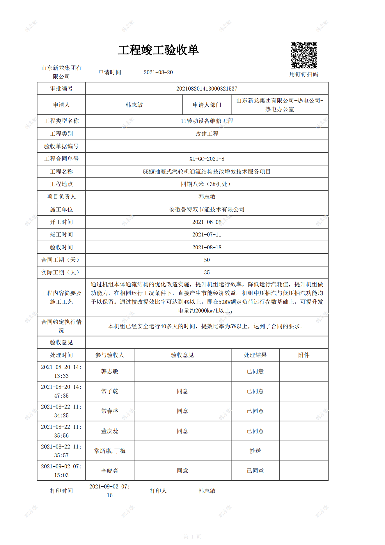 喜訊——山東新龍集團(tuán)55MW抽凝式汽輪發(fā)電機(jī)組通流改造節(jié)能提效EPC項(xiàng)目順利通過(guò)工程驗(yàn)收