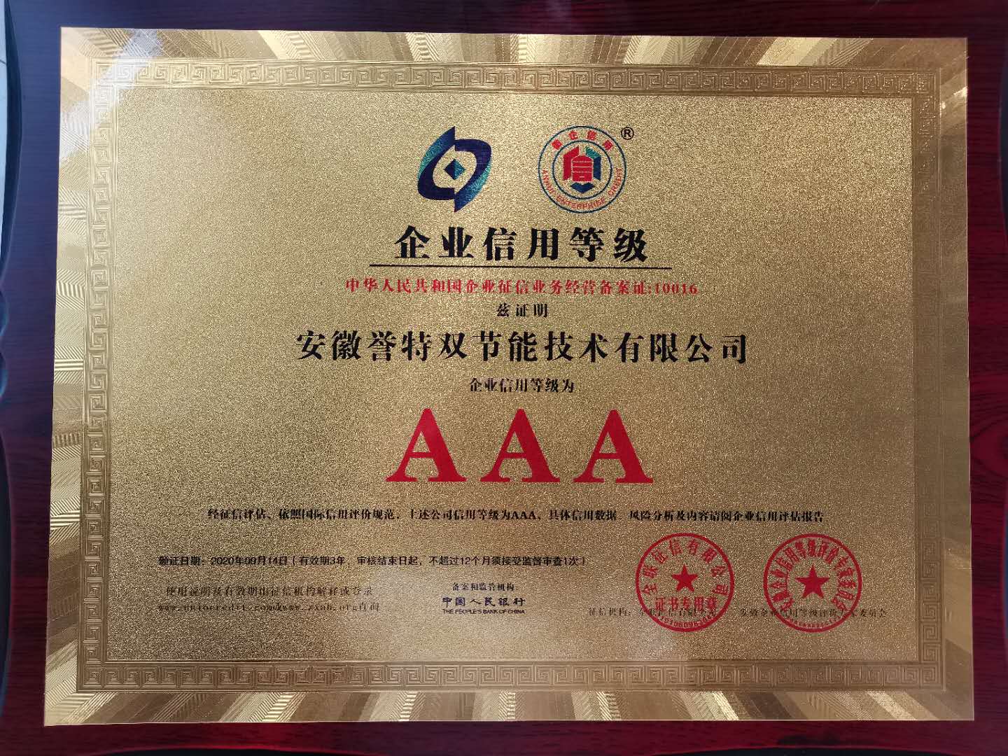 9月1日,2020年度安徽企業(yè)信用評(píng)價(jià)工作,經(jīng)企業(yè)自主申報(bào),市經(jīng)信局篩選推薦,由安徽企業(yè)信用等級(jí)評(píng)價(jià)專家委員會(huì)、安徽省徽企質(zhì)量信用評(píng)價(jià)中心審核、認(rèn)定,并正式予以公布,我公司入選“安徽AAA級(jí)信用企業(yè)”,總經(jīng)理袁克同志入選2020年度“安徽省優(yōu)秀誠(chéng)信企業(yè)家”。