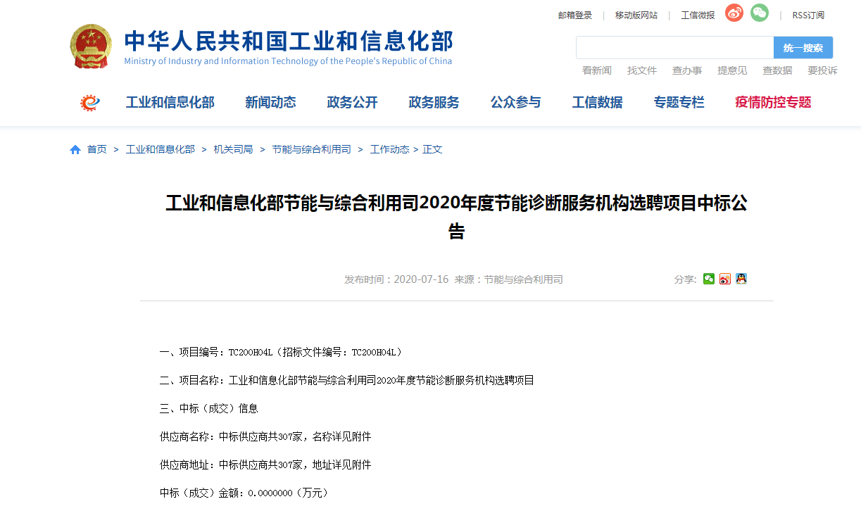 2020年7月15日,公司成功中標(biāo)工業(yè)和信息化部節(jié)能與綜合利用司“2020年度國(guó)家節(jié)能診斷服務(wù)機(jī)構(gòu)選聘項(xiàng)目合格供應(yīng)商”.