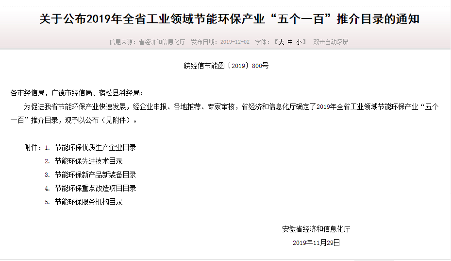 熱烈祝賀我公司入選安徽省2019年度全省工業(yè)領(lǐng)域節(jié)能環(huán)保產(chǎn)業(yè)“五個一百”推介目錄