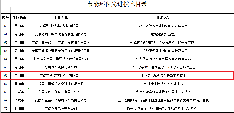 12月2日,安徽省經(jīng)濟和信息化廳發(fā)布了2019年全省工業(yè)領(lǐng)域節(jié)能環(huán)保產(chǎn)業(yè)“五個一百”推介目錄公告,安徽譽特雙節(jié)能技術(shù)有限公司入選《節(jié)能環(huán)保服務(wù)機構(gòu)目錄(2019)》,也是蕪湖市唯一的入選單位,同時公司節(jié)能技術(shù)“工業(yè)蒸汽輪機技改提效節(jié)能技術(shù)”入選《節(jié)能環(huán)保先進技術(shù)目錄(2019)》。