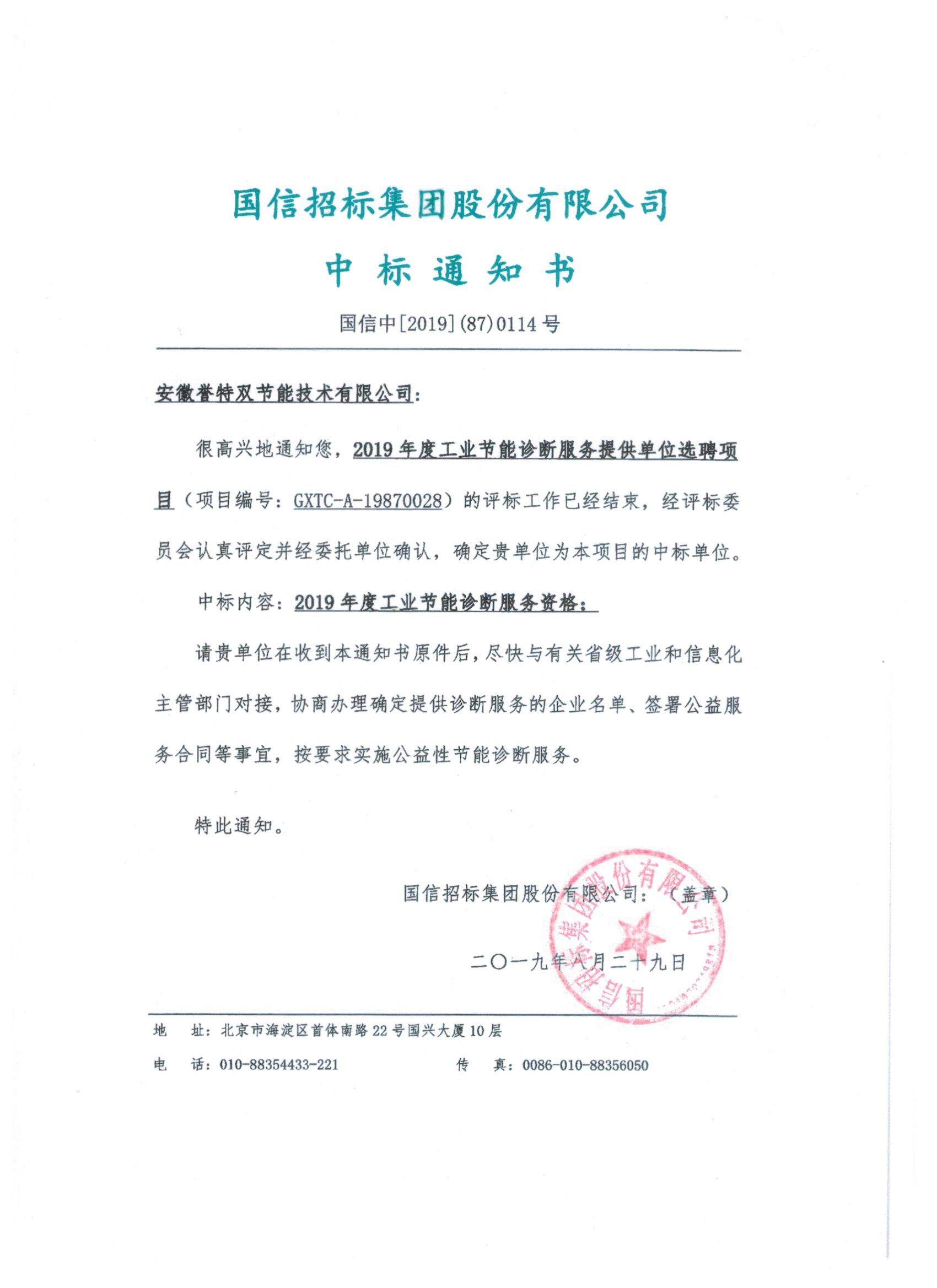 2019年8月30日,公司成功入選工業(yè)和信息化部節(jié)能與綜合利用司“2019年度工業(yè)節(jié)能診斷服務(wù)提供單位選聘項(xiàng)目”。(http://www.ccgp.gov.cn/cggg/zygg/zbgg/201908/t20190829_12790036.htm)