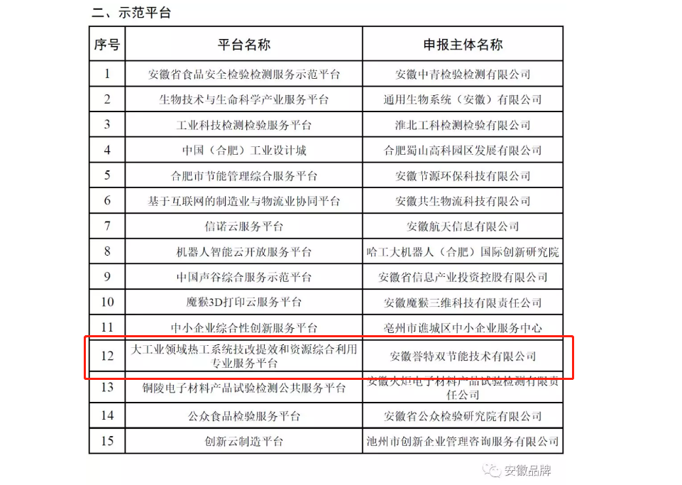近日,我公司——大工業(yè)領(lǐng)域熱工系統(tǒng)技改提效和資源綜合利用專業(yè)服務(wù)平臺(tái),經(jīng)安徽省經(jīng)信廳,認(rèn)定為安徽省第二批省級(jí)服務(wù)型制造示范平臺(tái),全省共計(jì)評(píng)定出15個(gè)專業(yè)性服務(wù)示范平臺(tái),含金量高,社會(huì)影響力強(qiáng)。