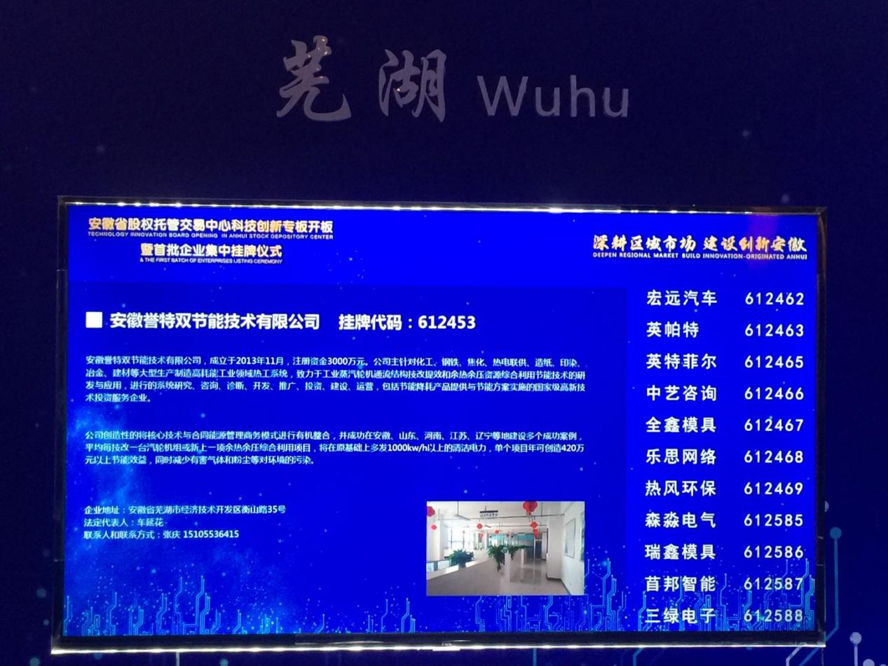 4月24日上午,安徽省股權(quán)托管交易中心科技創(chuàng)新專板開板暨首批企業(yè)集中掛牌儀式在合肥市隆重舉行,全省首批掛牌企業(yè)787家,譽特雙公司榮耀成為首批掛牌企業(yè)之一,股票代碼:612453。