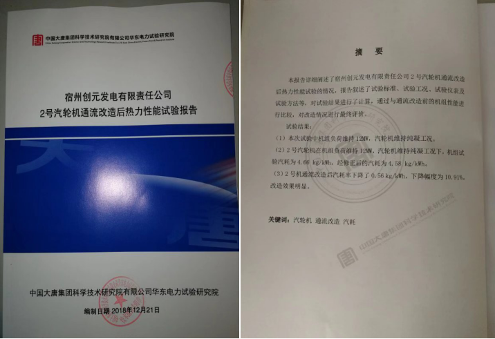 由具備國家一級專業(yè)資質(zhì)——中國大唐集團科學技術(shù)研究院有限公司華東電力試驗研究院,對照機組改造前實際運行參數(shù),純凝運行工況汽耗值為5.14kg/kw.h,改造后機組純凝工況汽耗值為4.58kg/kw.h,在同等運行工況條件下,汽耗值下降0.56kg/kw.h,下降幅度即節(jié)能提效比例為10.91%,按原機組12MW同等運行工況條件下,可實現(xiàn)節(jié)能提效電量為1309.2kw/h,按年運行7500小時計算,年可實現(xiàn)節(jié)能經(jīng)濟效益490萬元,節(jié)能效益與社會效益均非常顯著。