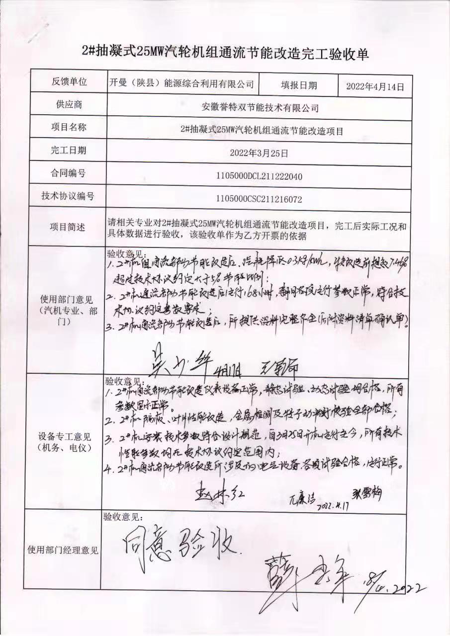 近日,我公司承接的三門峽開曼(陜縣)能源綜合利用有限公司25MW抽凝式2#汽輪機(jī)組通流結(jié)構(gòu)技改提效EPC項(xiàng)目,順利通過工程驗(yàn)收,實(shí)測(cè)節(jié)能提效比例高達(dá)7.46%,遠(yuǎn)超合同約定的5%考核指標(biāo),在此表示熱烈祝賀!