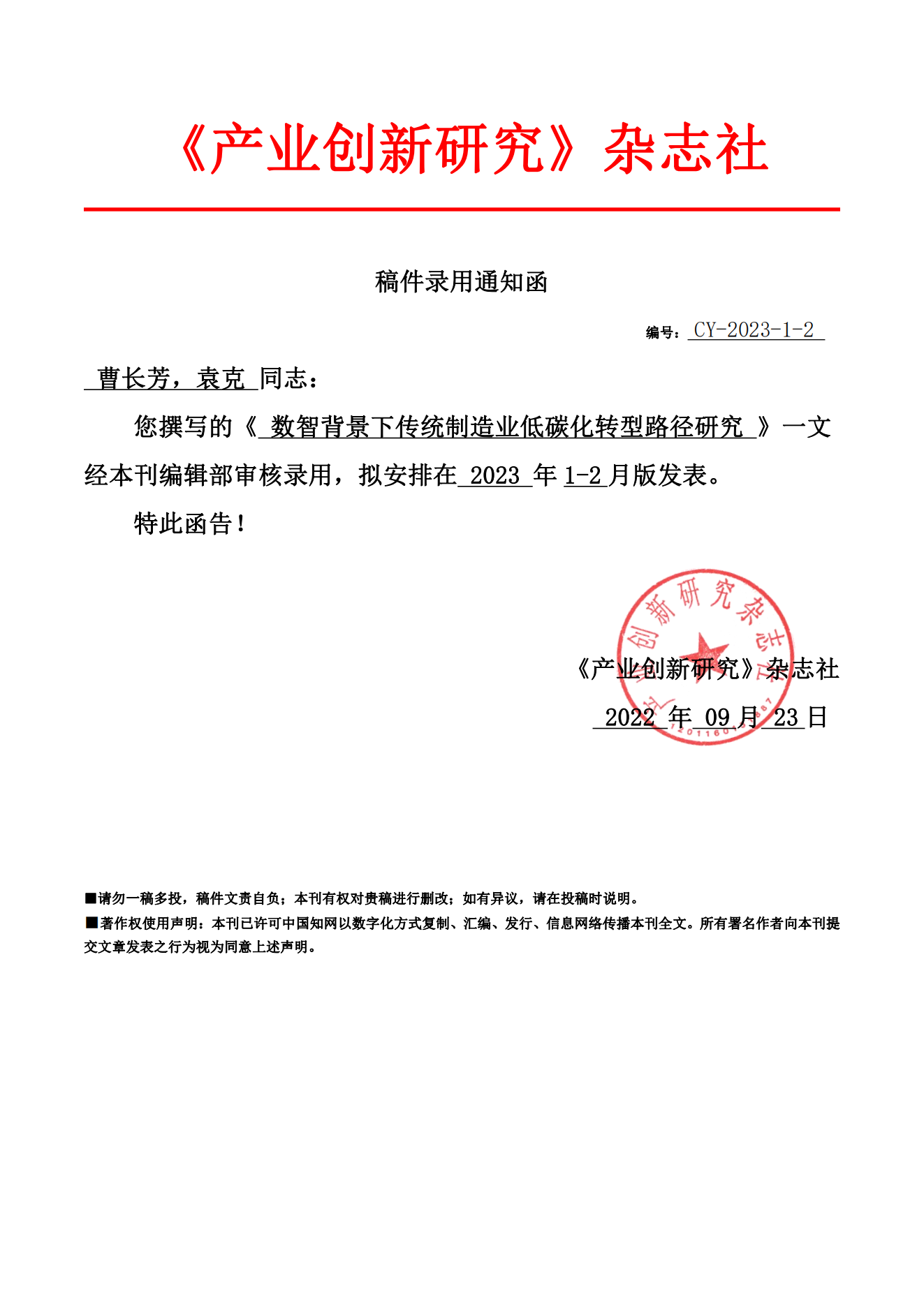 近日,我公司參與撰寫的專業(yè)學(xué)術(shù)論文《數(shù)智背景下傳統(tǒng)制造業(yè)低碳化轉(zhuǎn)型路徑研究》,經(jīng)國家新聞出版總署的部級(jí)期刊《產(chǎn)業(yè)創(chuàng)新研究》雜志社審核通過并予以錄用,擬安排在2023年1-2月版發(fā)表,在此表示熱烈祝賀。