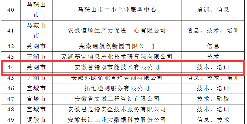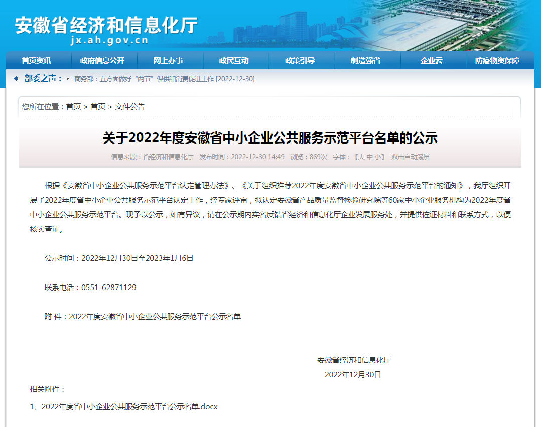 2022年12月30日,安徽省經(jīng)濟(jì)和信息化廳發(fā)布《關(guān)于公布2022年度安徽省中小企業(yè)公共服務(wù)示范平臺(tái)名單的通知》,我公司再次被認(rèn)定為2022年度安徽省中小企業(yè)公共服務(wù)示范平臺(tái)。本次全省共計(jì)評(píng)選出60家中小企業(yè)公共服務(wù)示范平臺(tái),其中蕪湖市僅4家,我公司榮列榜單。