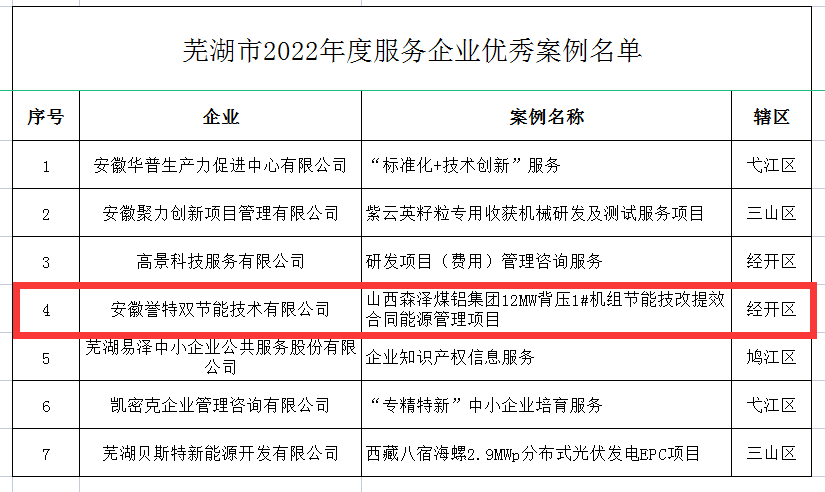2023年3月8日我公司合作案例——山西森澤煤鋁集團(tuán)12MW 背壓1#機(jī)組節(jié)能技改提效合同能源管理項(xiàng)目,入選蕪湖市2022年度服務(wù)企業(yè)優(yōu)秀案例,本次全市共計(jì)評(píng)選出15家服務(wù)企業(yè)優(yōu)秀案例,其中經(jīng)開(kāi)區(qū)4家,我公司榮列榜單。