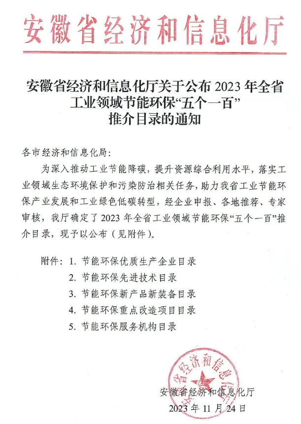 2023年11月27日,安徽省經(jīng)信廳公布2023年度全省工業(yè)領(lǐng)域節(jié)能環(huán)保“五個一百”推介目錄,我公司三個項目喜獲認(rèn)定,在此表示熱烈祝賀。