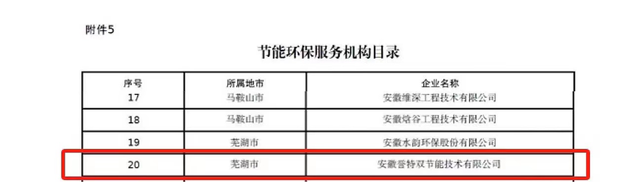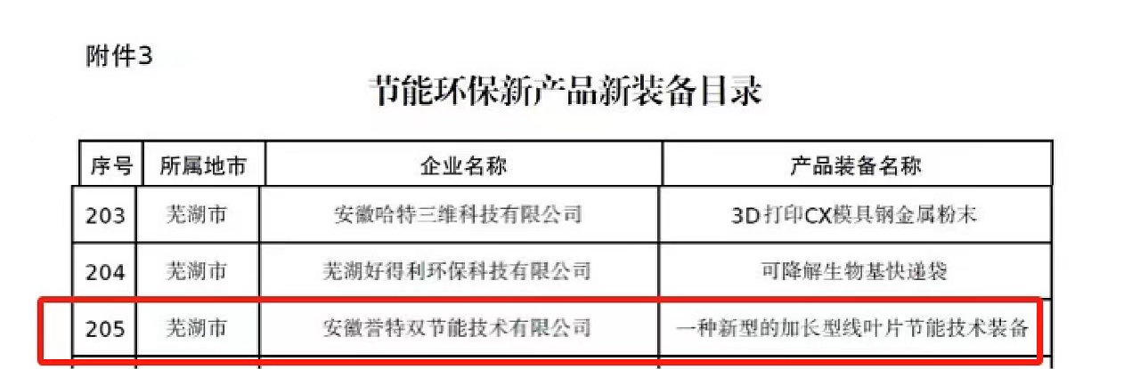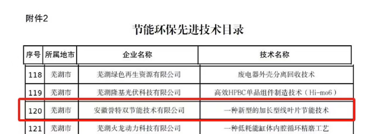 公司分別入選省“節(jié)能環(huán)保服務(wù)機(jī)構(gòu)目錄”、核心技術(shù)“一種新型的加長型線葉片節(jié)能技術(shù)”入選節(jié)能環(huán)保先進(jìn)技術(shù)目錄、核心產(chǎn)品“一種新型的加長型線葉片節(jié)能技術(shù)裝備”入選節(jié)能環(huán)保新產(chǎn)品新裝備目錄。其中,節(jié)能環(huán)保服務(wù)機(jī)構(gòu)目錄名單,安徽省全行業(yè)領(lǐng)域共28戶,蕪湖市僅2戶,我公司榮登榜單,此次入選,為公司連續(xù)6年入選,在此表示熱烈祝賀。