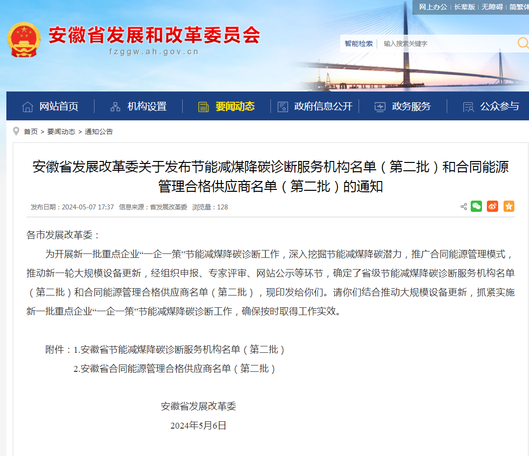 第二批安徽省發(fā)改委節(jié)能減煤降碳診斷服務機構和合同能源管理合格供應商資質名單