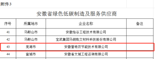 公司分別入選“安徽省綠色低碳產(chǎn)品(裝備)”、“安徽省綠色低碳技術(shù)”、“安徽省綠色低碳制造及服務(wù)供應(yīng)商”目錄。其中安徽省綠色低碳制造及服務(wù)供應(yīng)商目錄中,安徽省全行業(yè)領(lǐng)域共計(jì)58家企業(yè),我公司為蕪湖市唯一一家入選企業(yè),同時(shí)也是公司連續(xù)7年入選該目錄,再次表示熱烈祝賀!