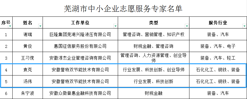 2025年3月6日,為完善蕪湖市中小企業(yè)服務(wù)體系建設(shè),促進(jìn)中小企業(yè)發(fā)展,為中小企業(yè)提供優(yōu)質(zhì)高效的服務(wù),由市工信局牽頭在全市范圍內(nèi)開展志愿專家征集評(píng)選工作,并最終確定52名各行業(yè)人員組成志愿專家團(tuán),我公司總經(jīng)理袁克、節(jié)能事業(yè)部長(zhǎng)湯偉兩位同志入選,在此表示熱烈祝賀。