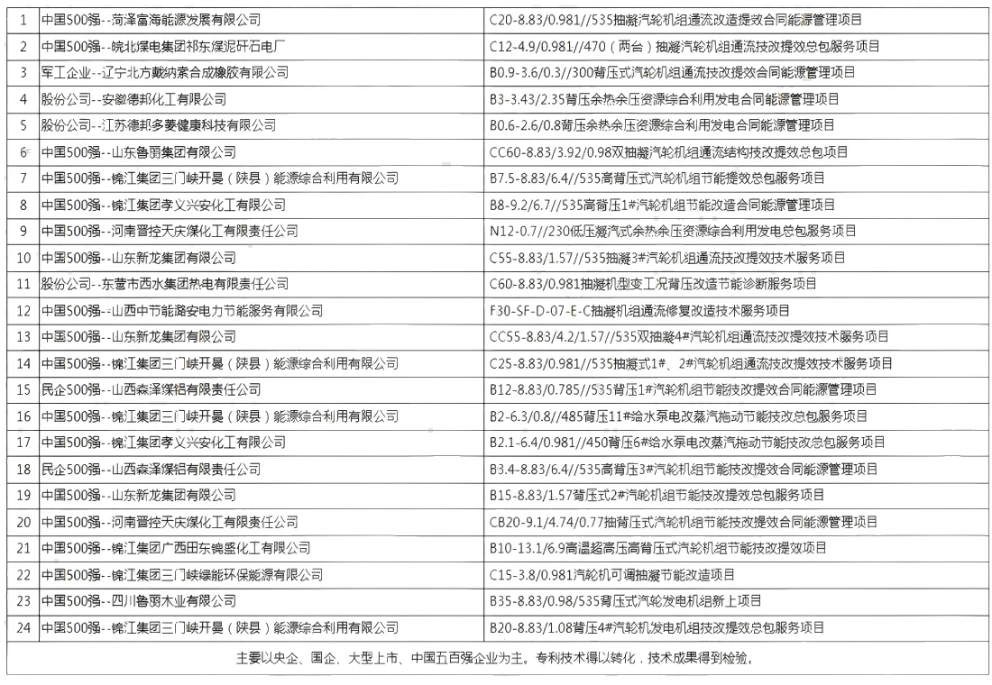 公司創(chuàng)造性的將核心技術(shù)與合同能源管理商務(wù)模式進(jìn)行有機(jī)整合,并成功在安徽、山東、河南、山西、江蘇等地建設(shè)多個(gè)標(biāo)桿業(yè)績,其中,在遼寧北方戴納索合成橡膠、菏澤富海集團(tuán)、山東魯麗集團(tuán)、山東新龍集團(tuán)、德邦化工集團(tuán)、山西晉控集團(tuán)、皖北煤電集團(tuán)、杭州錦江集團(tuán)、中國節(jié)能集團(tuán)、森澤煤鋁集團(tuán)等大型國有、全球五百強(qiáng)、上市企業(yè)落地實(shí)施,具有顯著的示范作用。